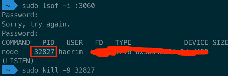 sudo kill -9 32827 // 포트 번호를 내 PID 로 교체
