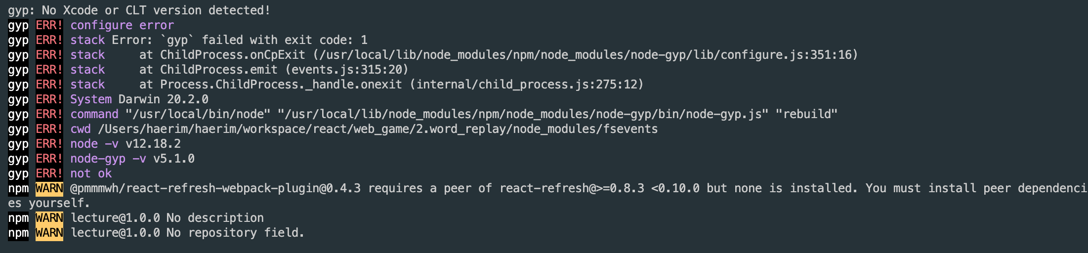 사실 여기서 에러난줄 모르고 계속 refresh 설치를 진행하다가 자꾸만 'ERR_INVALID_ARG_TYPE' 에러가 뜨길래